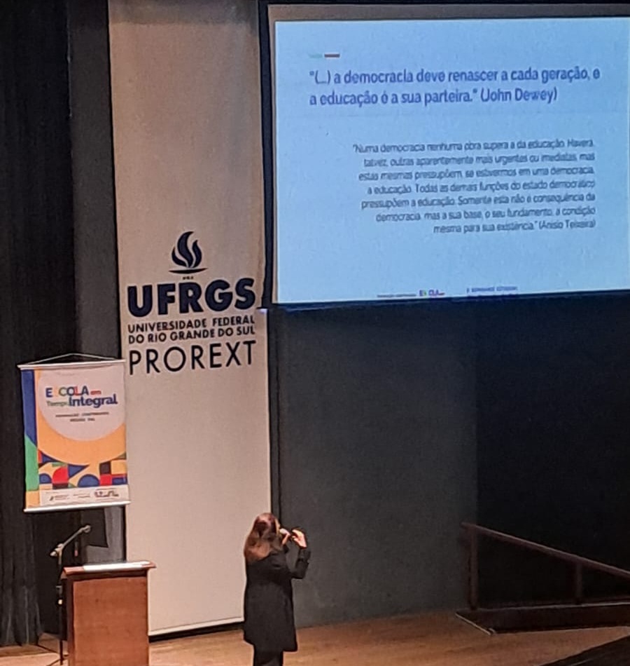 Nos dias 24 e 25 de julho, a presidente do Conselho Municipal de Educação (CME) marcou presença no II Seminário Estadual de Educação: construir e sustentar a Política de Educação Integral em Tempo Integral, realizado na Universidade Federal do Rio Grande do Sul (UFRGS), em Porto Alegre/RS.