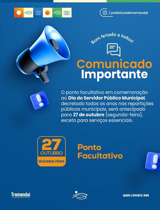 A Administração Municipal informa que, conforme o Decreto nº 5.471/2025, o ponto facultativo em comemoração ao Dia do Servidor Público Municipal será antecipado para o dia 27 de outubro de 2025 (segunda-feira).