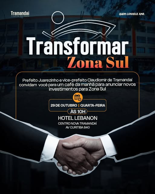 A Prefeitura de Tramandaí, por meio do Prefeito Juarezinho e do Vice-Prefeito Claudiomir, convida para um café da manhã que marcará o anúncio de novos investimentos para a Zona Sul do município que fazem parte do projeto Transformar Tramandaí.