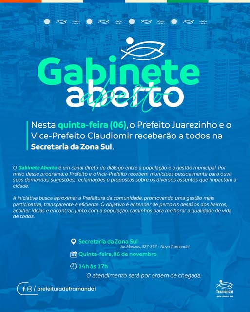 Nesta quinta-feira (06), o Prefeito Juarezinho e o Vice-Prefeito Claudiomir estarão na Zona Sul para mais uma edição do Gabinete Aberto, um momento dedicado à troca de ideias, escuta ativa e diálogo direto entre os cidadãos e a gestão municipal.