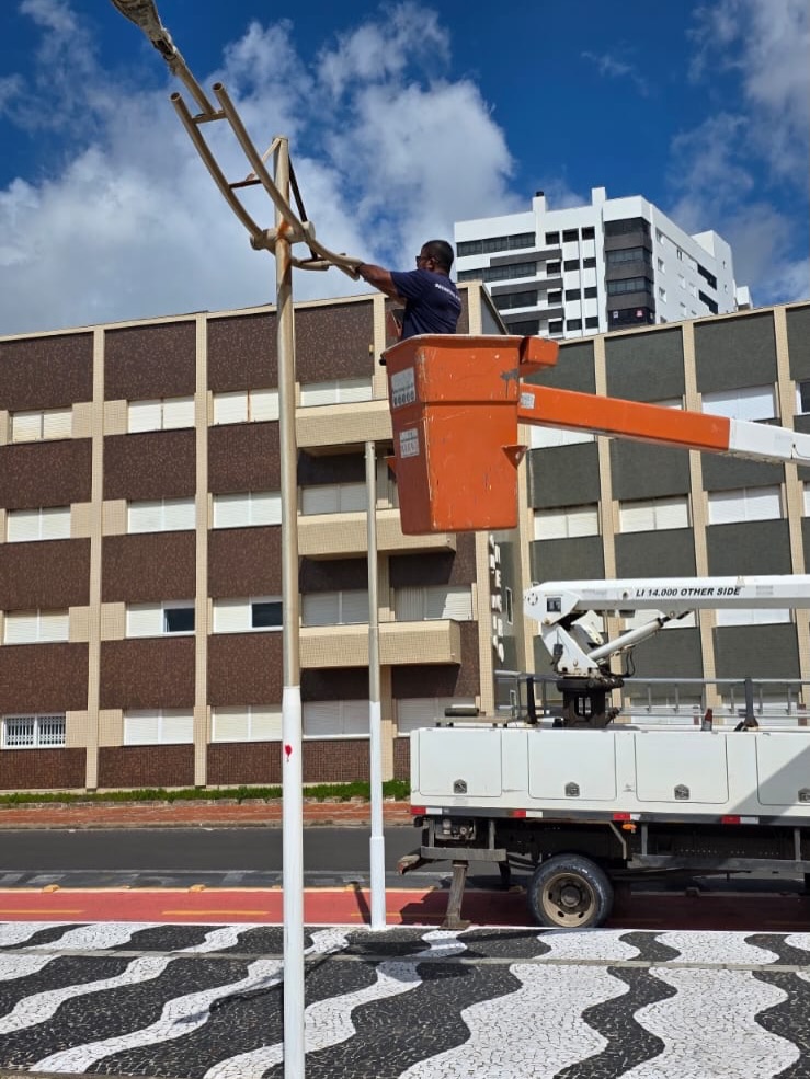 Reposição de lâmpadas e conserto de luminárias ao longo da Avenida Beira-Mar.