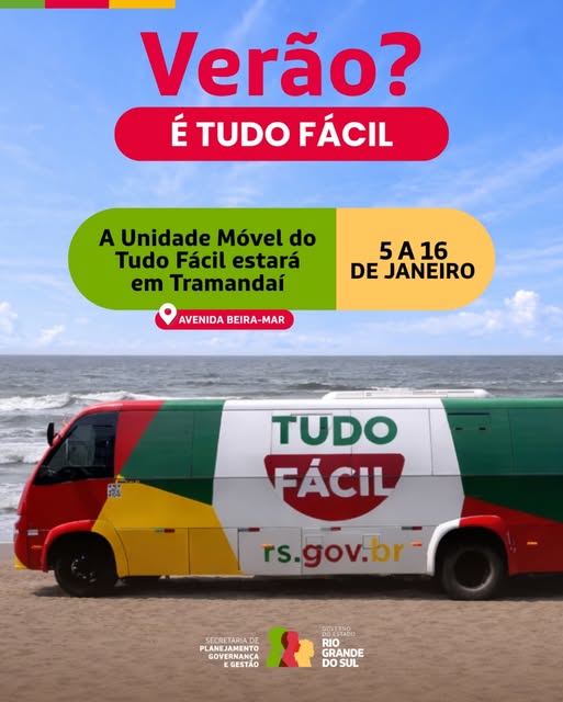 A Unidade Móvel do Tudo Fácil estará em Tramandaí, na Avenida Beira-Mar (em frente ao letreiro Eu Amo Tramandaí), entre os dias 5 e 16 de janeiro, levando serviços públicos de forma ágil, prática e acessível para moradores e veranistas.