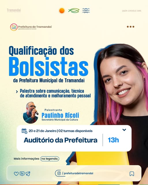 A Prefeitura de Tramandaí segue investindo na qualificação e no desenvolvimento dos seus bolsistas. Nos dias 20 e 21 de janeiro, serão realizadas duas turmas de capacitação, no Auditório da Prefeitura, a partir das 13h.